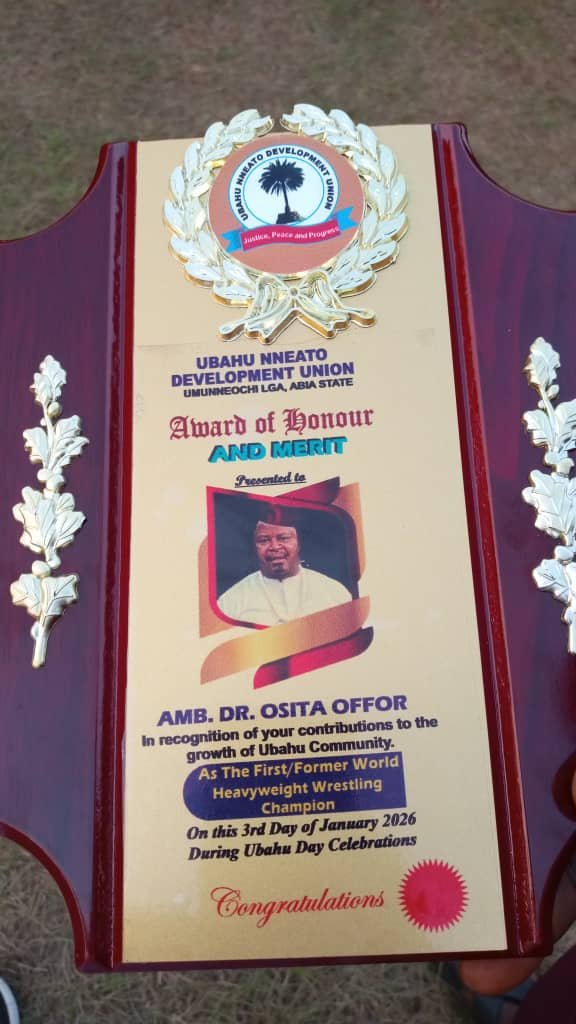 It was a moment of pride, history, and rich cultural celebration as Ambassador Dr Osita Offor “De Ultimate Commander” (Ikenga Gburugburu), was deservedly honoured with an Award of Honour as the First and Former Heavyweight Wrestling Champion, in recognition of his outstanding contributions to the growth, unity, and development of the Ubahu Community.