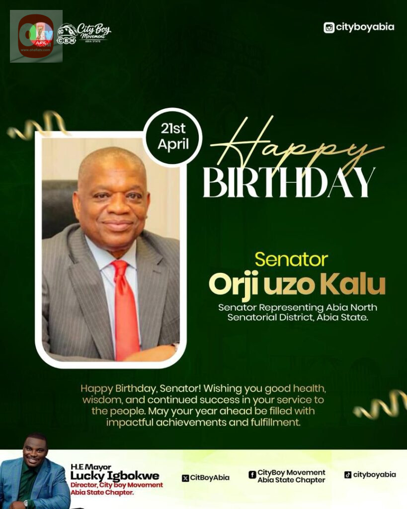 The Abia State Chapter of the City Boy Movement has extended warm birthday felicitations to former Abia State Governor and Senator representing Abia North, Orji Uzor Kalu, in recognition of his enduring contributions to leadership, business, and national service.