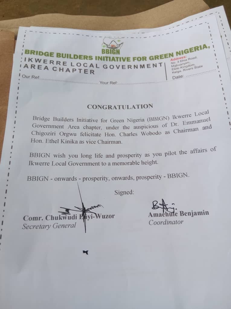 Home PoliticsIkwerre BBIGN Congratulates New Ikwerre LGA Council Chairman