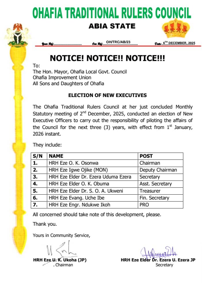 Home Abia StateOhafia Traditional Rulers Council Elects New Executive Officers To Man Her Affairs