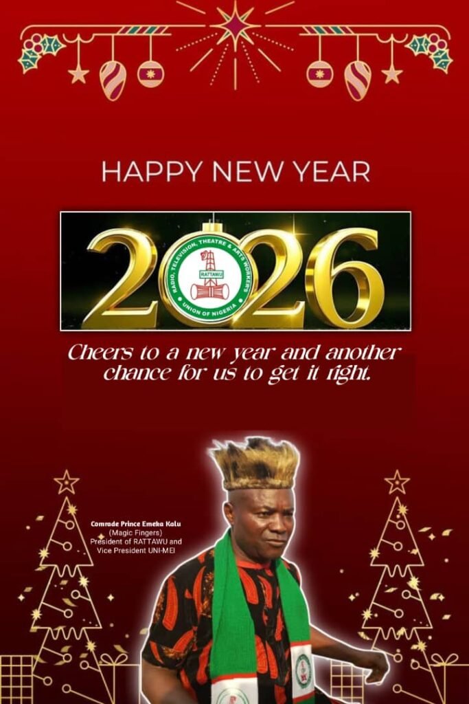 The President of the Radio, Television, Theatre and Arts Workers Union (RATTAWU) of Nigeria and the Vice President of UNI-MEI, Comrade Prince Emeka Kalu (Magic Fingers) sends his best wishes of love, peace and prosperity to members and Nigerians as the year 2026 is ushered in.